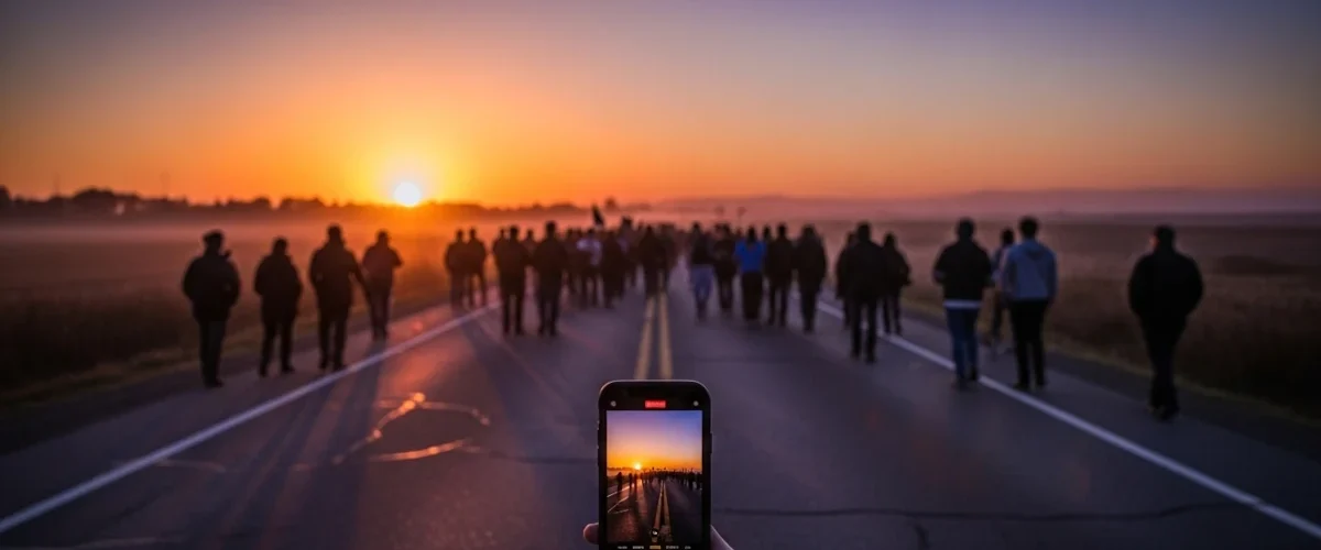 O que mudou é que a marcha contemporânea sabe que será filmada. Ela se organiza não apenas para ocupar a rua, mas para ocupar a tela. O sacrifício do corpo que caminha quilômetros sob o peso da exaustão e da história se tornou, também, narrativa visual.